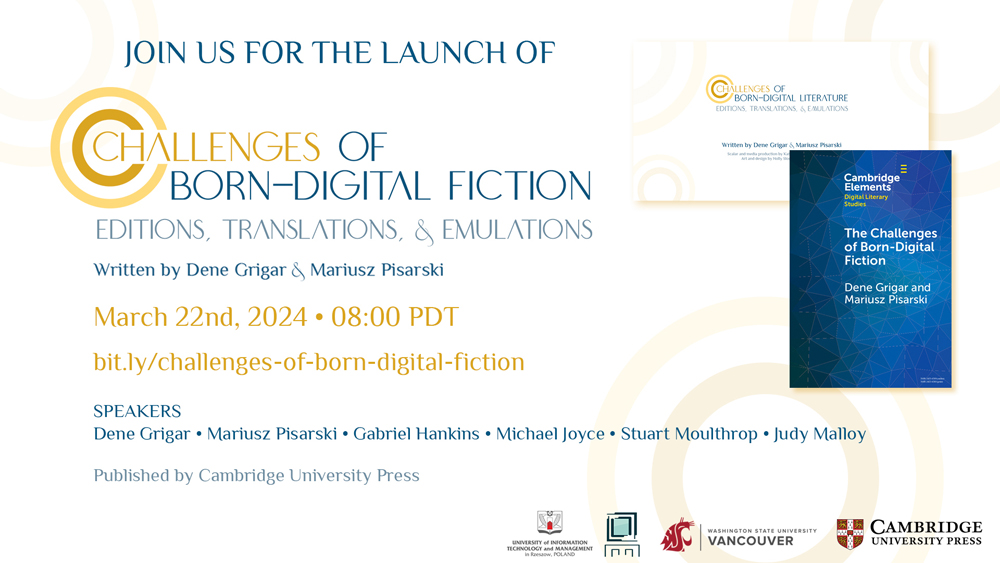 Join us for the launch of Dene Grigar and Mariusz Pisarski’s The Challenges of Born-Digital Fiction: Editions, Translations, and Emulations on March 22, 2024 at 8 a.m. PDT via Zoom. Particpants include editor Gabriel Hankins and artists Michael Joyce, Judy Malloy, and Stuart Moulthrop. Published by Cambridge University Press in its Element Series, the book addresses […]