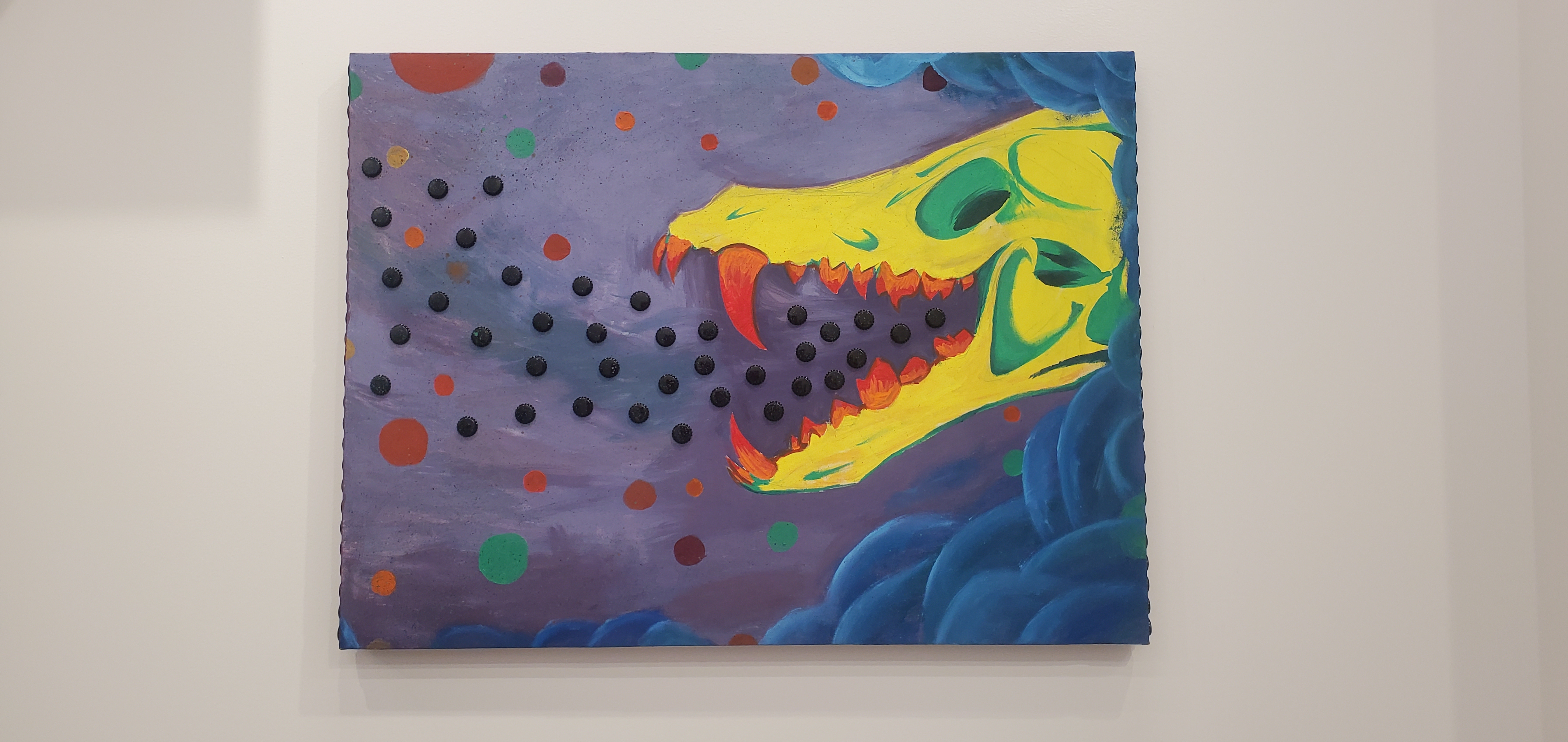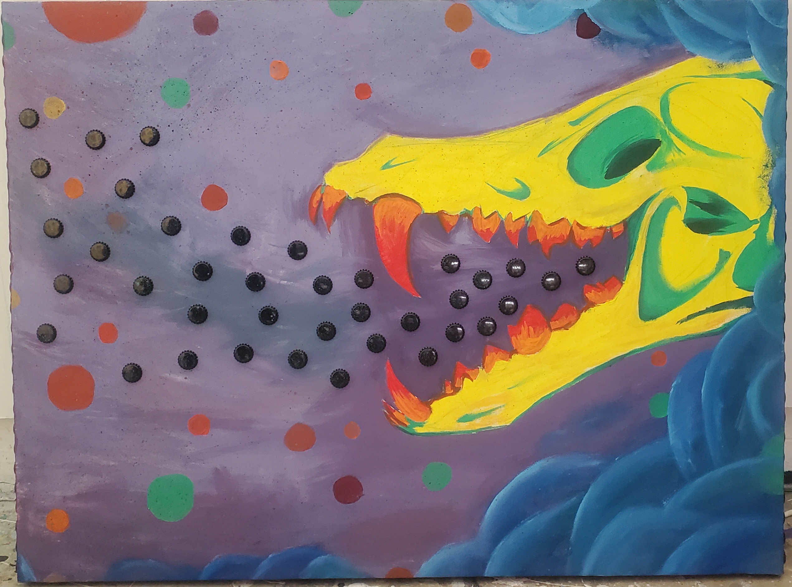 My abstract painting was based around mixtures of vibrant colors with shapes, patterns and colors. I wanted my subject to be “bottle caps and skulls”, so my piece contains an acrylic and oil paint mix painting of a coyote skull, as well as physical bottle caps attached onto and on the sides of the canvas.