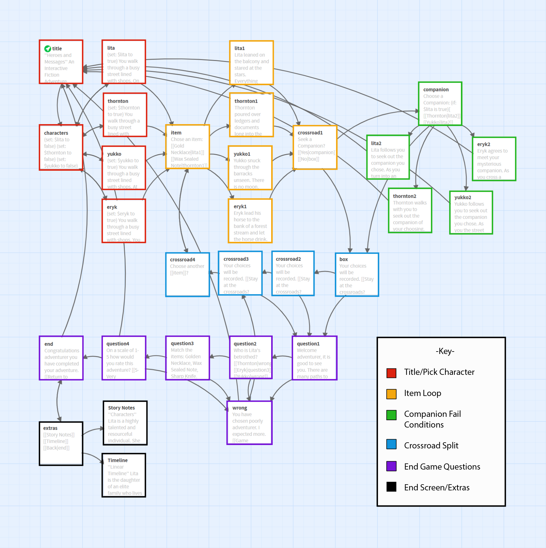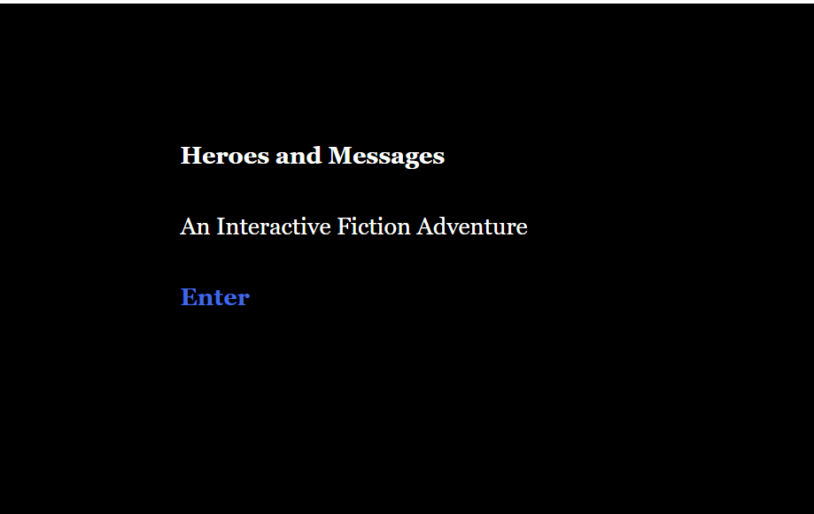 For this project I decided to expand my understanding of multi-media authoring, game design, and electronic literature through the creation of an interactive fiction adventure. I chose to create in Twine because the free software is designed to be user-friendly and easy to use with a basic knowledge of HTML and CSS. The game's format plays with the idea of non-linear storytelling and requires users to visit multiple story lines in order to successfully complete the game. To start your adventure click here.