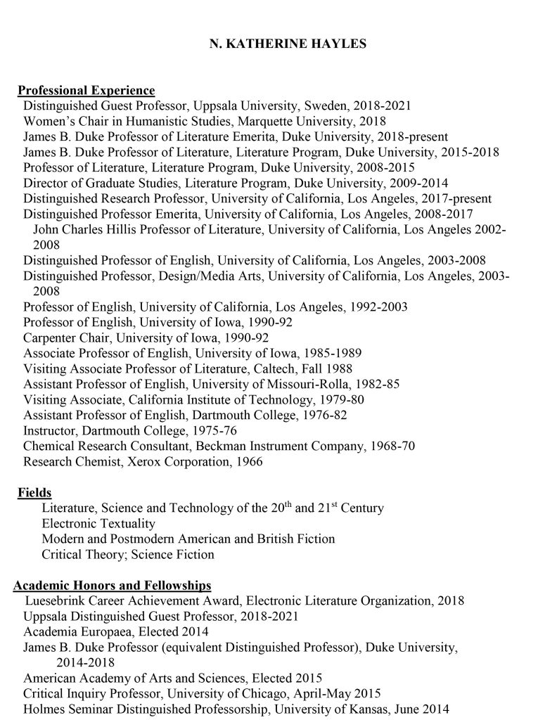 Below is N. Katherine Hayles’ Curriculum Vitae, presented on the page and formatted for download as a .pdf.