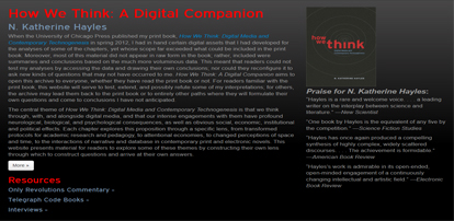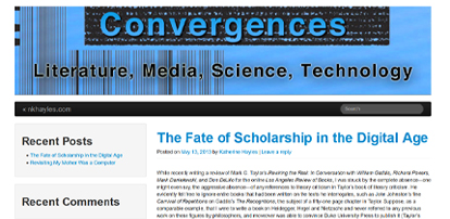During her career N. Katherine Hayles produced online resources and creative works. Below is the blog Convergences where she posted on topics relating to literature, media, science, and technology; speculat1ons.net, an alternate reality game co-authored with Patrick Jagoda and Patrick LeMieux; and the companion site for her book, How We Think.