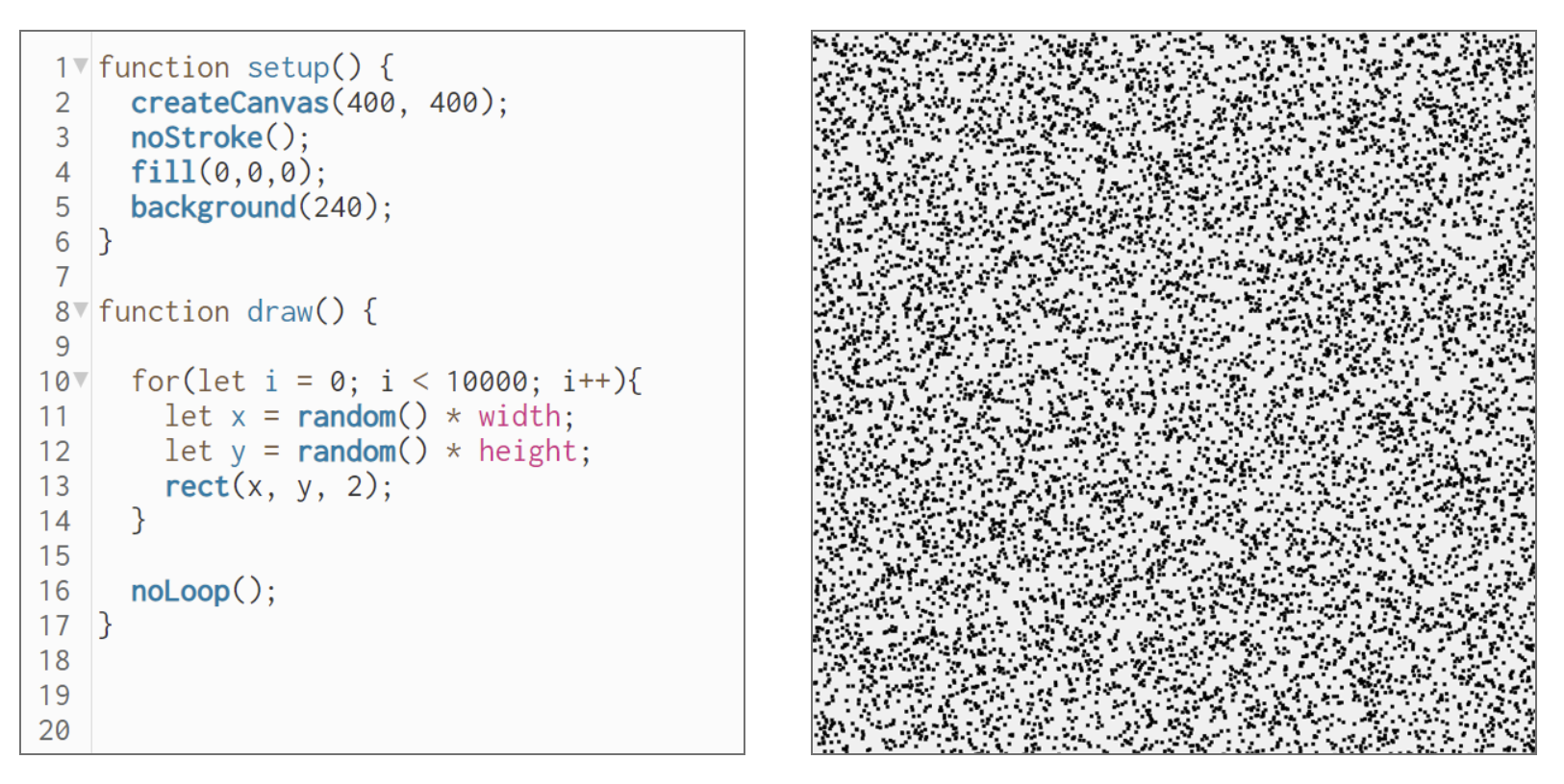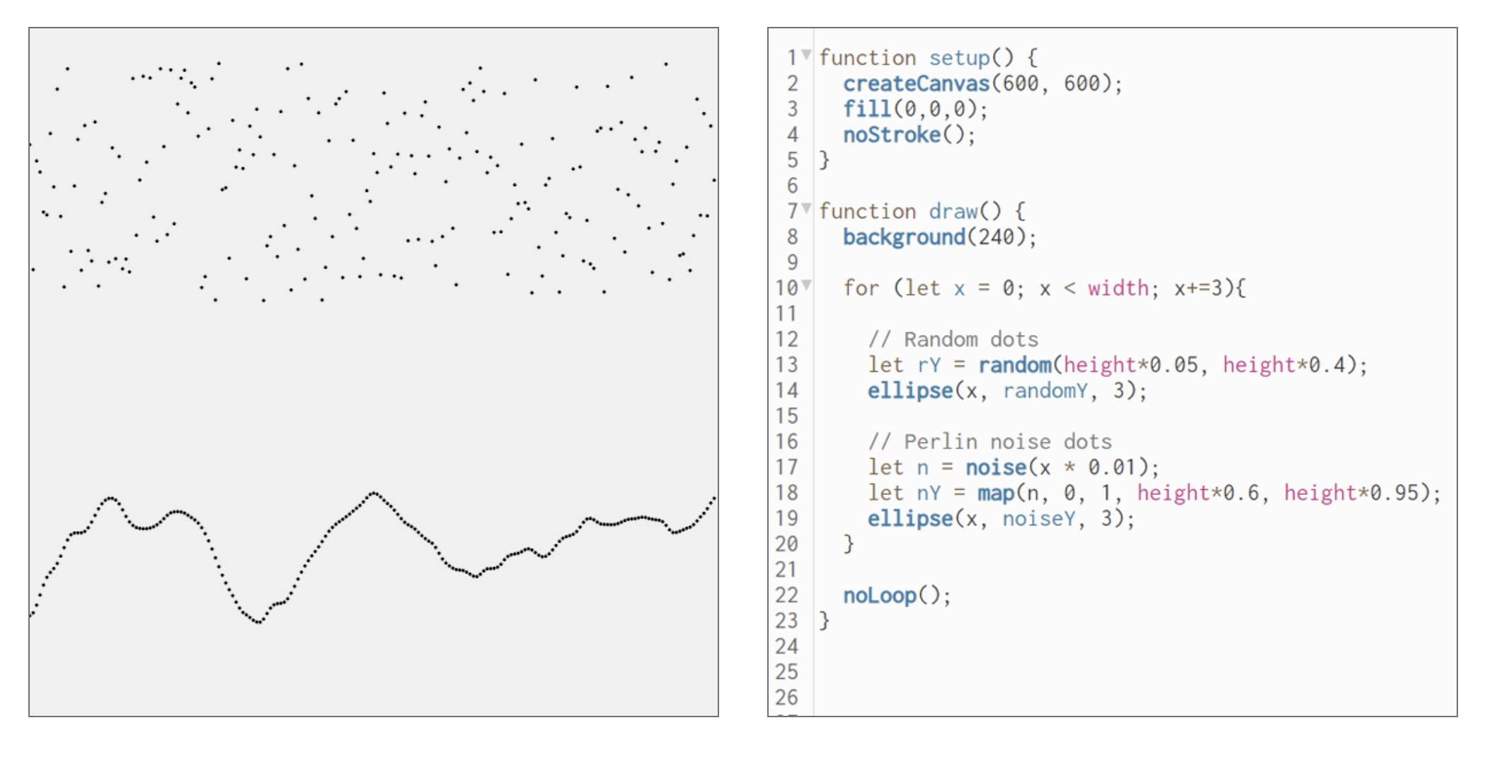 The noise() function in p5.js uses Perlin noise: a smooth, gradient-based form of randomness that avoids abrupt changes and is often used to add natural variation in movement, color, or shapes. By sampling noise at various scales or "octaves," artists produce effects of terrains, clouds, or fluid dynamics. Controlled yet unpredictable.