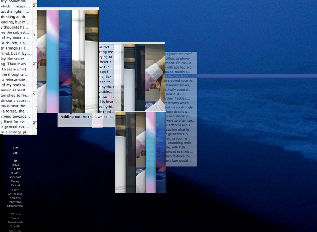 This multimedia fiction, in which no single page is ever the same, explores the liminality of the "web book" as a space between abundance and loss, novelty and familiarity, integration and dispersion.
