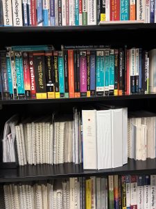 Last week James and I finished moving everything to it and getting things somewhat organized so that we could see what we actually had. Today I went back and laid out the manuals so that the order makes some sense. For example, I put all of the Adobe manuals together, all of the Apple software manuals, etc. That way, if we need to consult a manual about Flash MX 2004 (yes, it still happens), we know exactly where it is located–and more importantly, we can reach it without tripping over boxes and chairs and a hundred other items stuffed behind the curtains as it was in the MOVE.