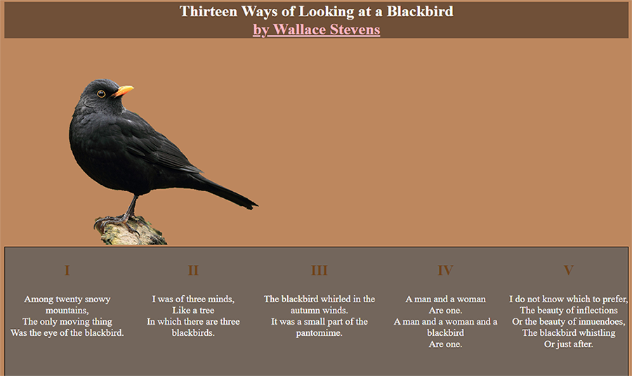 For the Blackbird project, we took the poem "Blackbird" by Wallace Stevens and recreated it's visual to present the stanzas in a unique way using the grid method. Additonal information on the author is also provided at the bottom of the page where a link can be found that will take you to his page on Wikipedia.
