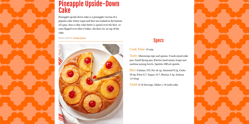 Our recipe project was by far my favorite. I decided to go with a Pineapple Upside-Down Cake recipe to present in my website. In this project I had a deeper understanding of using grid in the css layout. I also chose this recipe because my family has often made this cake when I was younger and it reminds me of the time when we would visit my grandmother on holidays. It was very fun making this project and sharing it with my peers.