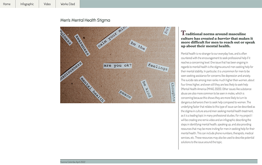 This is a website I created for a different class where we also created two different media objects that represented our topic. The first is an infographic created in Adobe Photoshop, and the second is a video remix created in Adobe Premiere Pro. The website was made using html and css, also including multiple pages and a few separate style sheets.