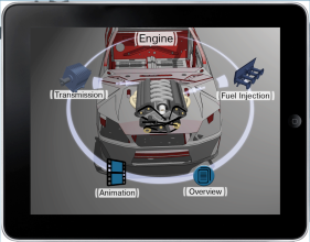 Ultimately, the project is going to entail a car unibody angled above the ground with the tail end rising up over seven feet. On the car body, we will place three interest points that will prompt devices running Junaio, the augmented reality reader for Metaio. This will display the inner workings of the automobile, communicating through animation, graphics, hypertext and 3D models. Three dedicated tablets will be installed on mounts that allow for access to the technology for visitors. Programs used to develop this exhibit include Unity, Metaio, Objective C, and Xcode.
