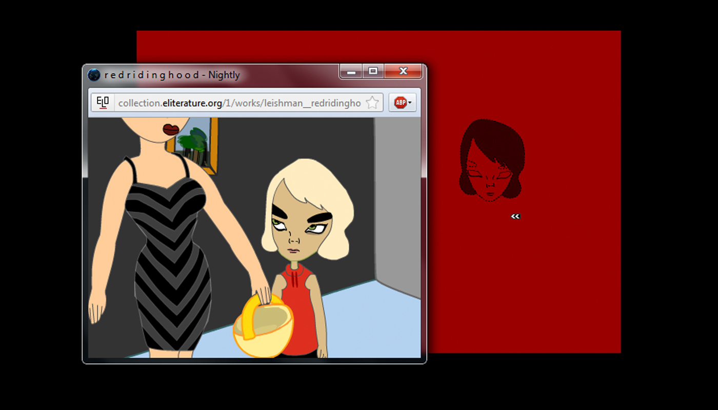 Leishman's playful retelling of the Little Red Riding Hood fairy tale makes use of comic book vernacular, limited forms of explorative interaction, optional narrative paths, and a jazzy soundtrack. RedRidinghood is the type of Flash piece that suggests the potential for complex forms of interactive storytelling without typographic text.